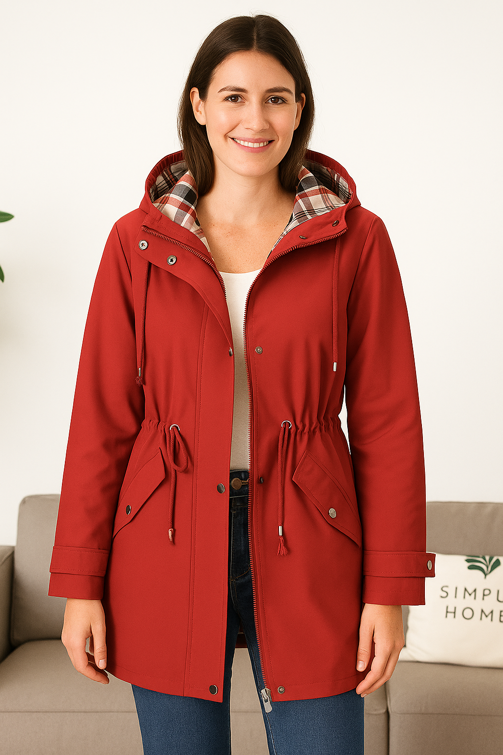 Dit is de oplossing: deze stijlvolle rode regenjas houdt je droog én laat je er fantastisch uitzien. Het zachte ruitjes-voering geeft extra warmte, terwijl de getailleerde pasvorm en trekkoordjes een mooi silhouet creëren.