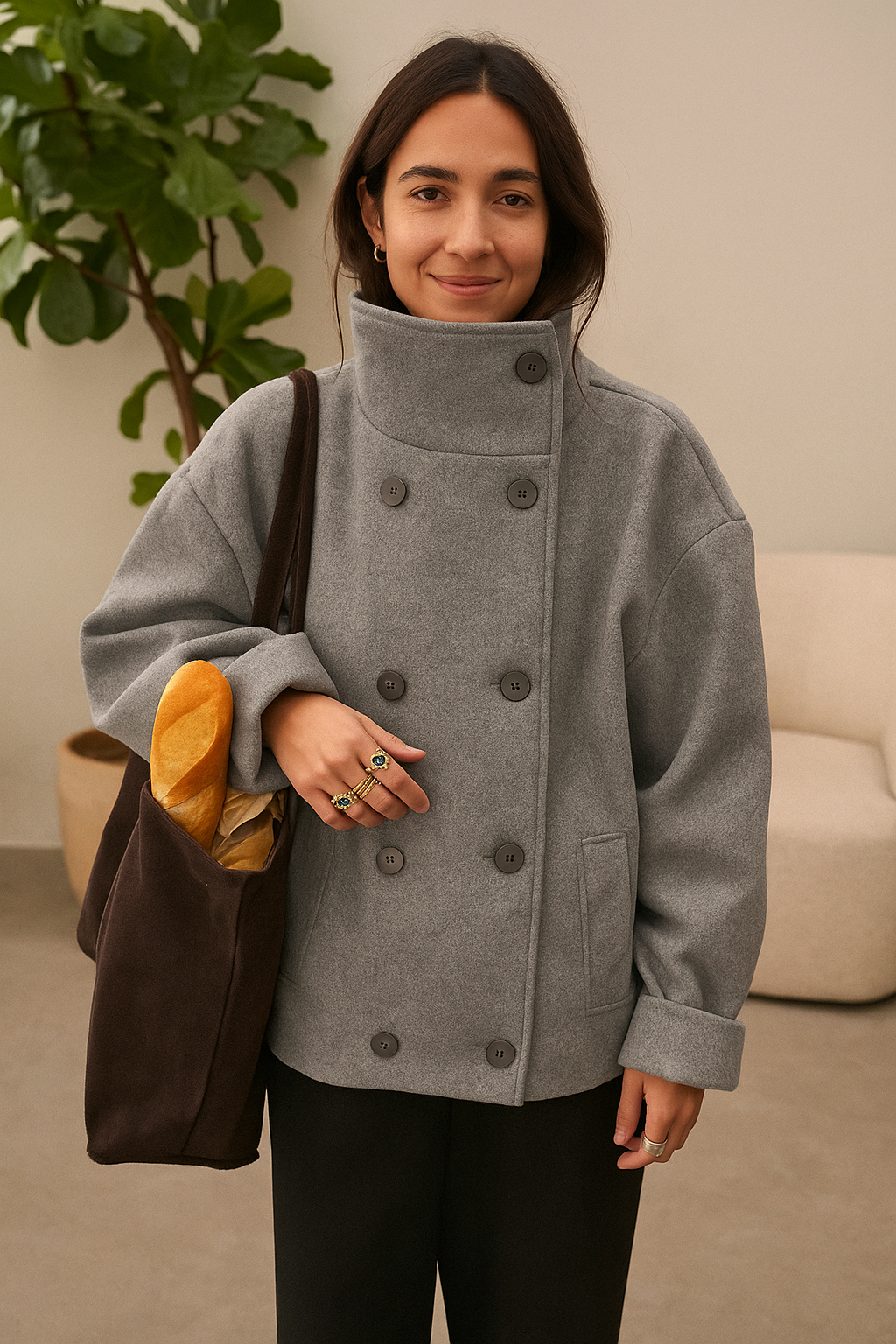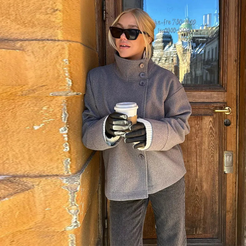 De oplossing: deze grijze high-neck jas van een zachte wool blend. Het minimalistische ontwerp met een hoge kraag en dubbele knoopsluiting geeft je direct een stijlvolle, moderne uitstraling – zonder in te leveren op comfort.